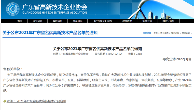 近日,廣東省高新技術產業協會公布了2021年廣東省名優高新技術產...