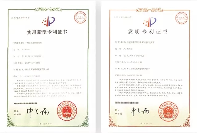 堅持自主技術創(chuàng)新,企業(yè)才能生存發(fā)展,這是榮冠多年來深刻認識并實踐得出的真理。2013-2014年,榮冠勇于淘汰落后產(chǎn)能和工藝,不斷改良西瓦燒結隧道窯技術以及西瓦干燥窯的干燥車設備,并且成功申請了發(fā)明專利;2014年榮冠陶瓦大膽進行技術革新,采用鏤空H型支架承托瓦片燒制,生產(chǎn)出國內(nèi)最大尺寸的平板瓦和羅曼瓦,填補了國內(nèi)高端項目依賴進口瓦的一項空白......從零到壹,從無到有,榮冠已經(jīng)獲得了20多項外觀設計及實用新型專利證書。