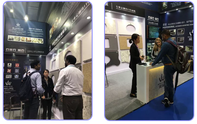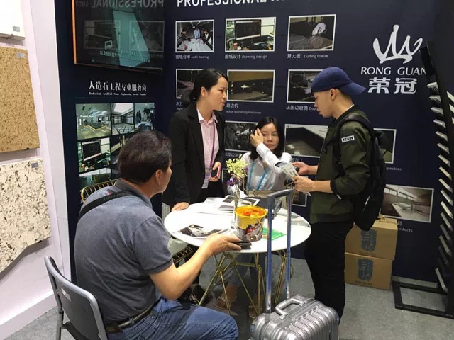 榮冠出口部工作人員向蒞臨展位的客戶講解了榮冠石英石臺(tái)面產(chǎn)品的品質(zhì)優(yōu)勢,與來自全球各地的客商深入洽談合作。