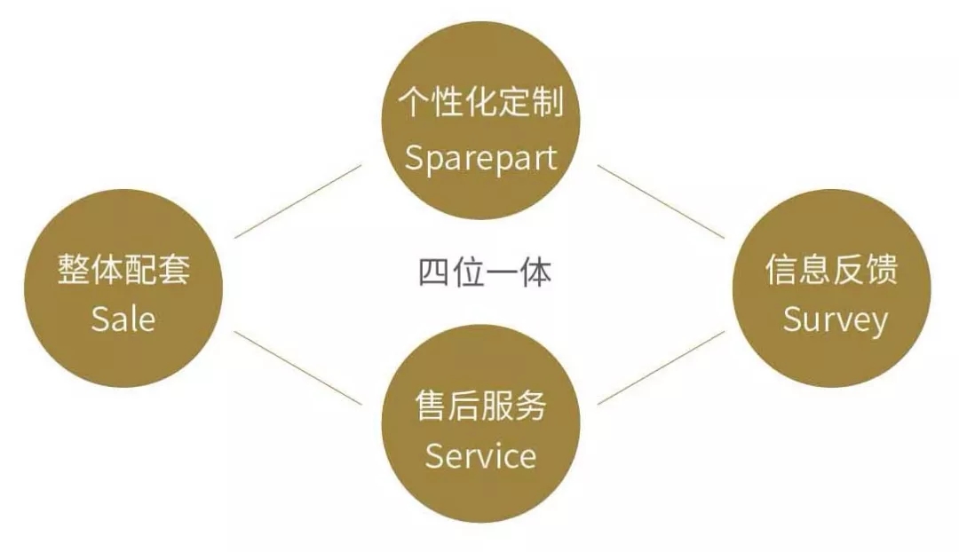 榮冠致力于為客戶提供家居生活整體配套裝修解決方案,通過與發展商合作向用戶提供菜單式4s精裝修服務。即在提供集標準化、個性化于一體的全鏈條服務同時,通過整體配套銷售(Sale)、個性化定制(Sparepart)、售后服務(Service)與信息反饋(Survey),建榮冠-開發商-業主的三級機制,領創行業先潮。