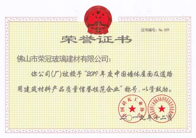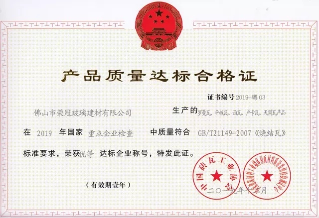 2019年12月13-15日,“2019年全國墻體屋面及道路用建筑材料產(chǎn)品質(zhì)量分析總結(jié)會暨綠色高質(zhì)量發(fā)展論壇”在安徽省淮北市隆重召開。榮冠建材在會上被授予“2019年度中國墻體屋面及道路用建筑材料產(chǎn)品質(zhì)量信譽模范企業(yè)”榮譽稱號,公司生產(chǎn)的羅曼瓦、平板瓦、西瓦、盧卡瓦、天筒瓦產(chǎn)品在國家重點企業(yè)檢查中榮獲“ 優(yōu)等達標企業(yè) “ 稱號。