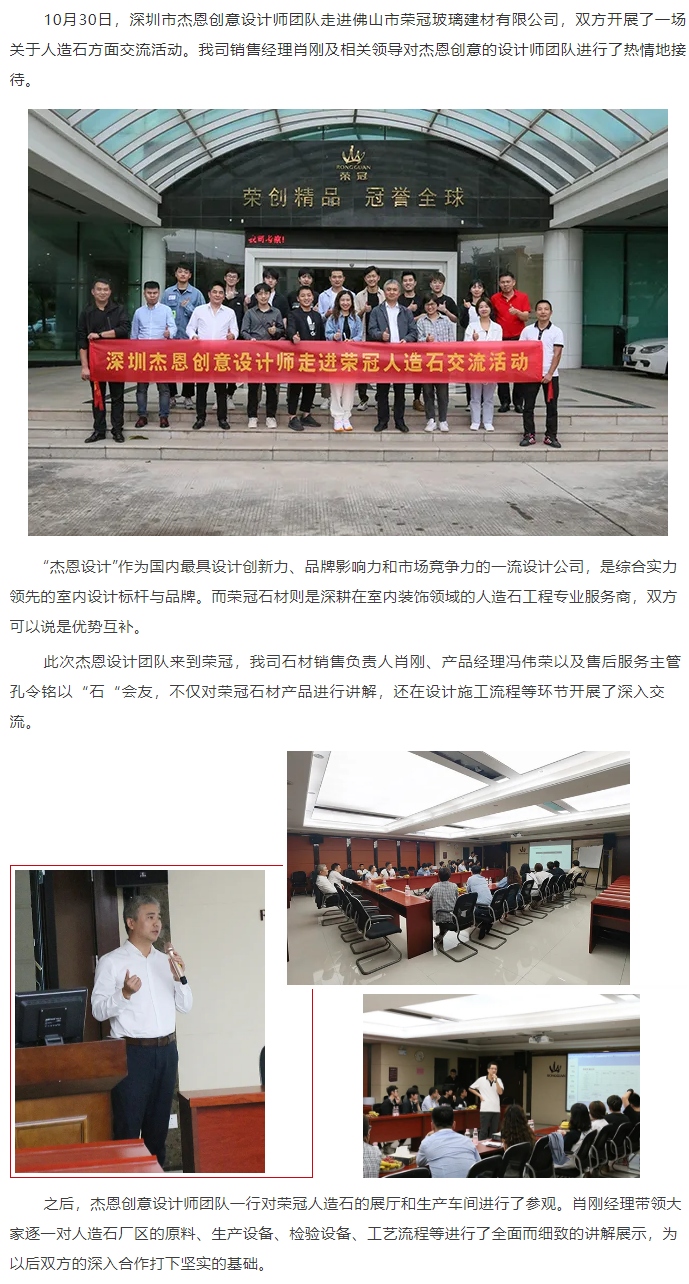 10月30日,深圳市杰恩創意設計師團隊走進佛山市榮冠玻璃建材有限公司,雙方開展了一場關于人造石方面交流活動。