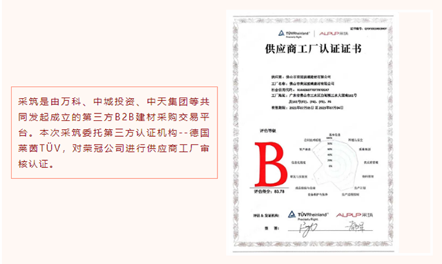 成功獲得供應商工廠認證證書,不僅僅是采筑平臺對榮冠產品的技術力和創新力的認可,也是萬科等頭部陣營戰略合作伙伴對榮冠公司的生產、研發、質控、供貨、服務的全面信賴。榮冠公司將聚焦采筑平臺的需求,以優質的產品體系、豐富的資源儲備及創新的技術應用,助力各大地產開發商筑建精品工程。