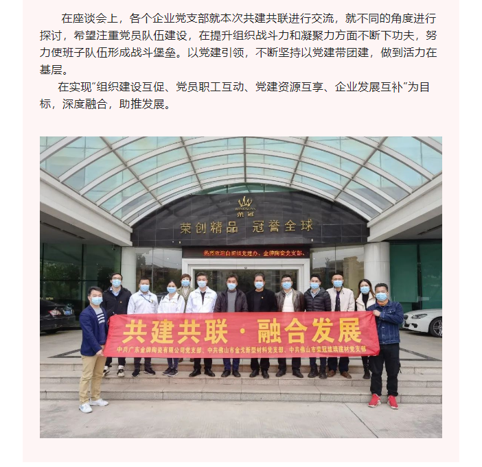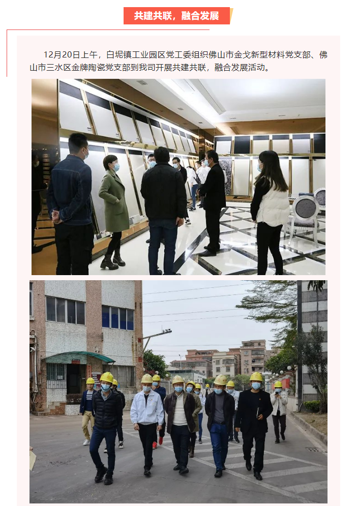 12月20日上午,白坭鎮工業園區黨工委組織佛山市金戈新型材料黨支部、佛山市三水區金牌陶瓷黨支部到我司開展共建共聯,融合發展活動。