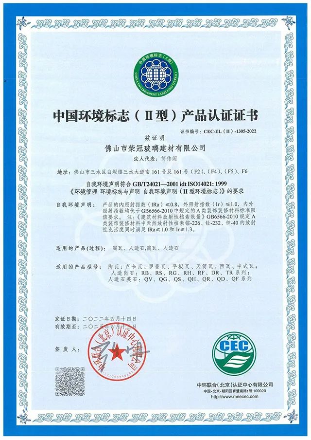 中國環(huán)境標志II型認證是目前國內(nèi)最權(quán)威的綠色產(chǎn)品、環(huán)保產(chǎn)品認證證書,是我國對產(chǎn)品環(huán)境行為進行認證并授予產(chǎn)品使用的唯一政府標識。榮冠此次獲得中國環(huán)境標志II型認證的兩種產(chǎn)品(陶瓦、人造石),各項性能指標均優(yōu)于相關(guān)標準要求,帶給客戶的不僅僅是產(chǎn)品的美觀和實用,更是實實在在的安全、健康和放心。