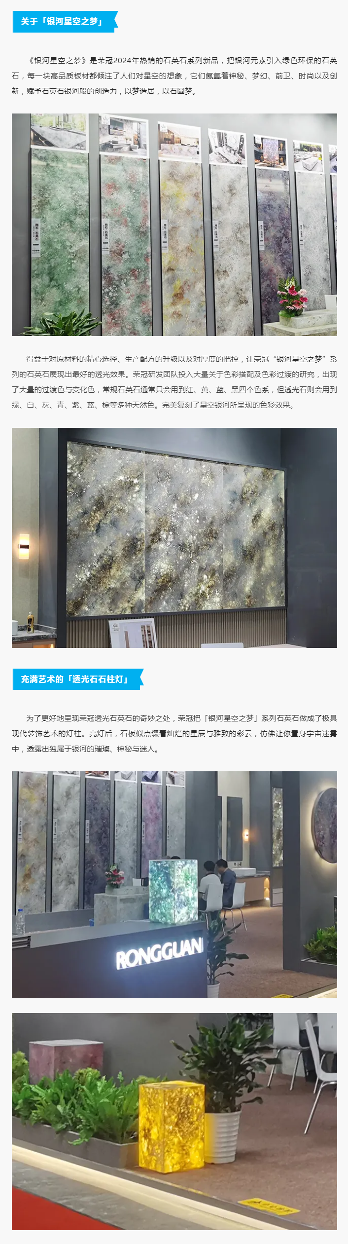 2024年5月14-17日,榮冠石材攜人造石新品—《銀河星空之夢》系列精彩亮相第28屆中國國際廚房、衛浴設施展覽會,力求為觀展者帶來了一場的身處于宇宙星空一般的石材視覺美學盛宴。