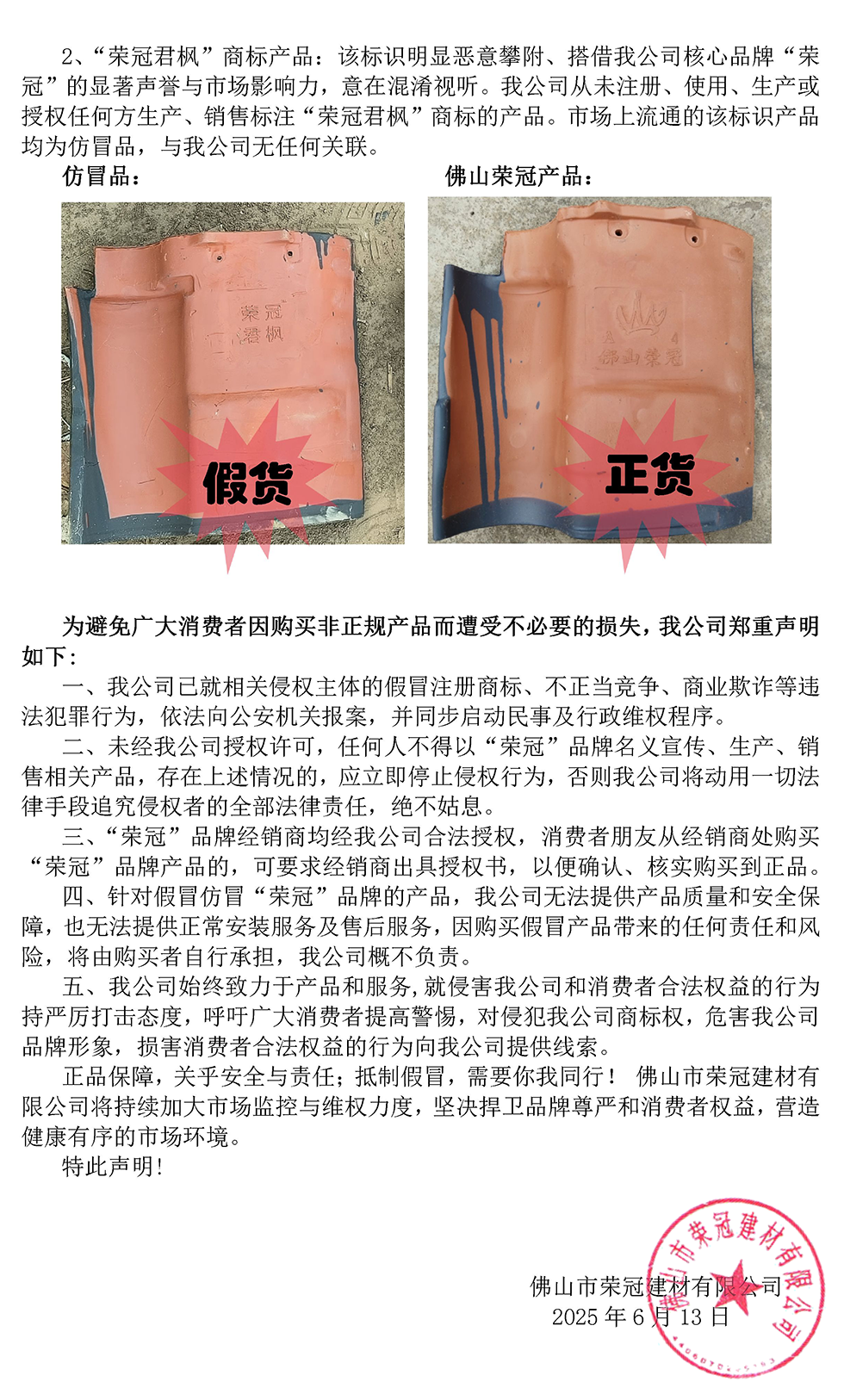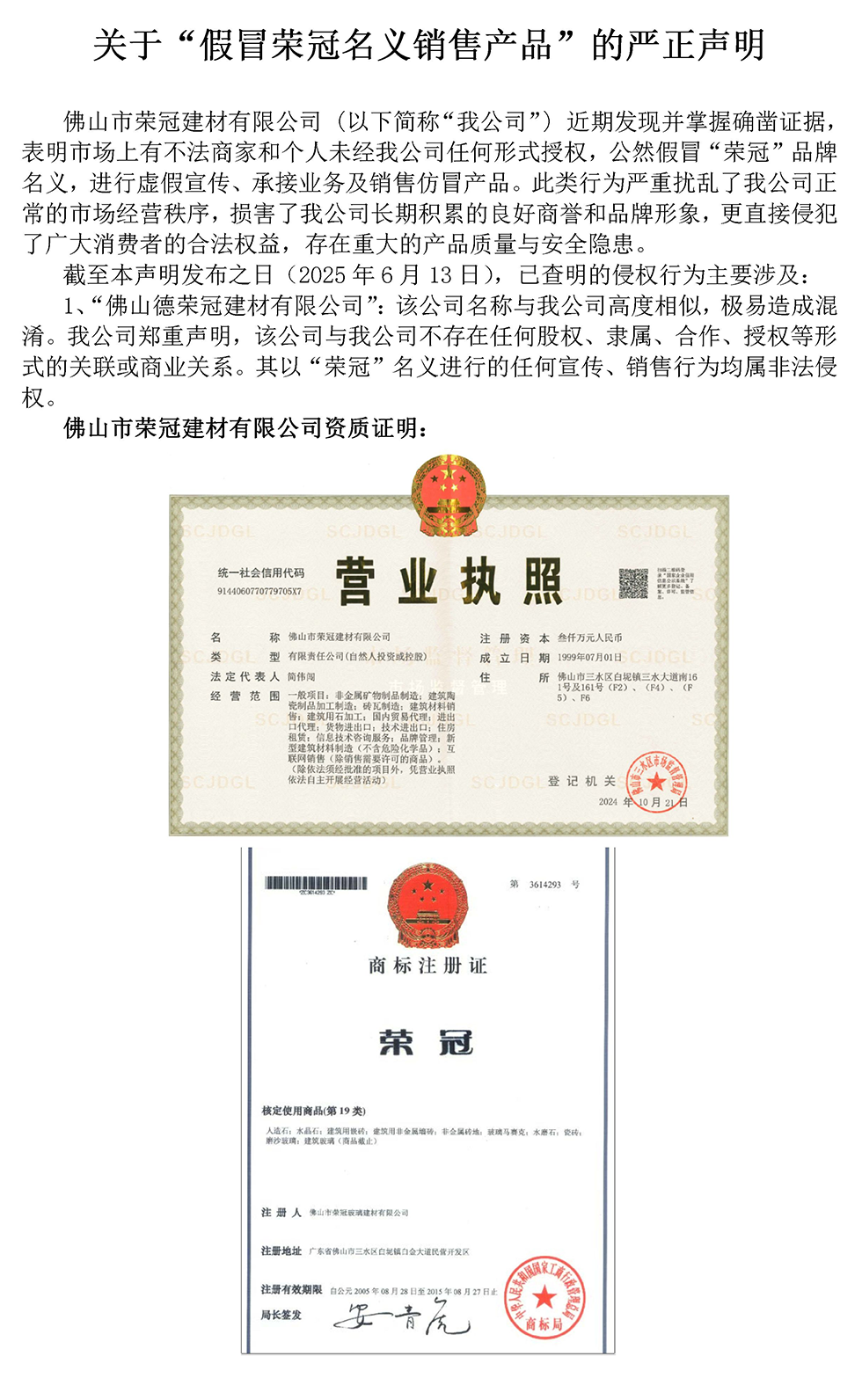 摘要:佛山市榮冠建材有限公司(以下簡(jiǎn)稱“我公司”)近期發(fā)現(xiàn)并掌握確鑿證據(jù),表明市場(chǎng)上有不法商家和個(gè)人未經(jīng)我公司任何形式授權(quán)......