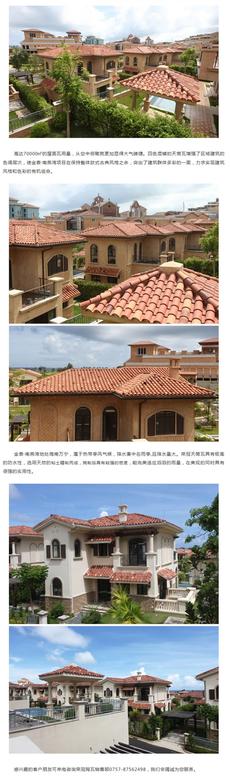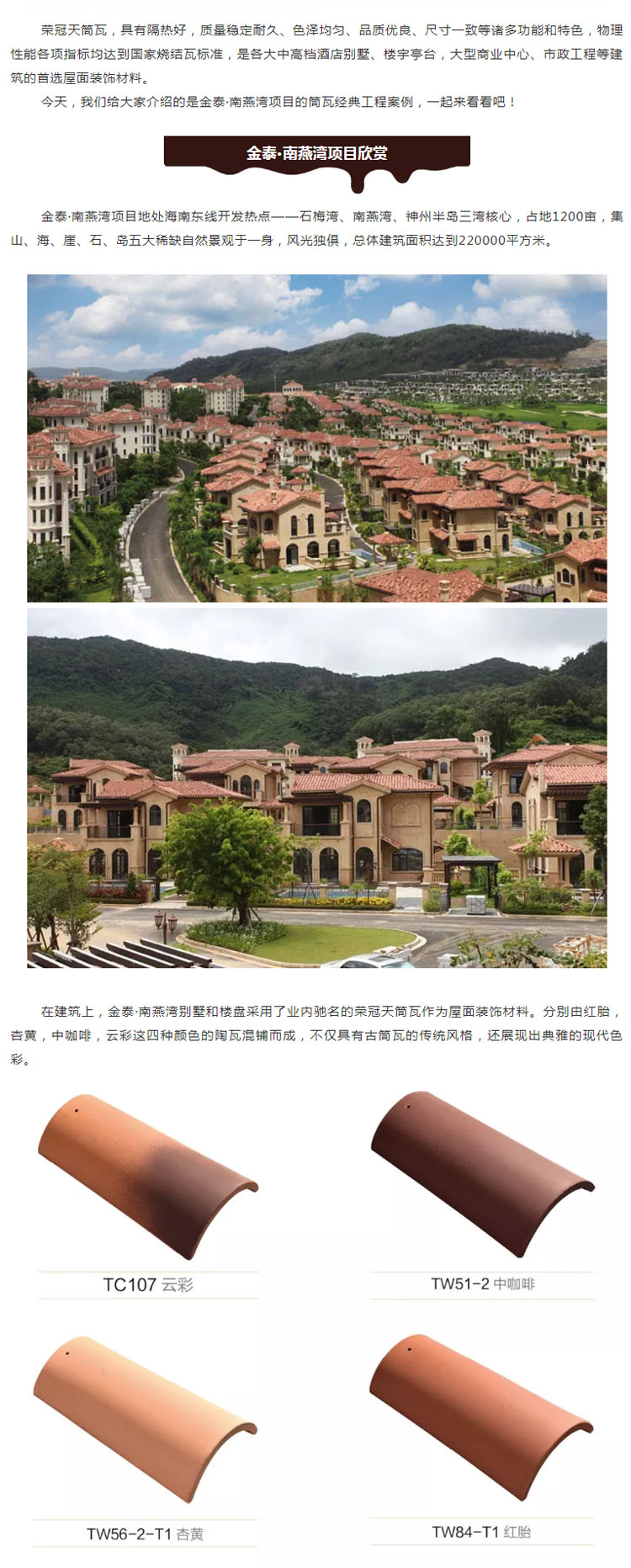 榮冠天筒瓦,具有隔熱好,質量穩定耐久、色澤均勻、品質優良、尺寸一致等諸多功能和特色,物理性能各項指標均達到國家燒結瓦標準,是各大中高檔酒店別墅、樓宇亭臺,大型商業中心、市政工程等建筑的首選屋面裝飾材料。